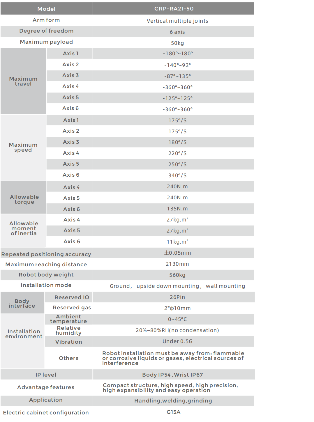 Arm span of 2.13m, strong load capacity, large working range and high flexibility. Fast operation speed, repeated positioning accuracy, suitable for handing, assembly, grinding and other scenarios.